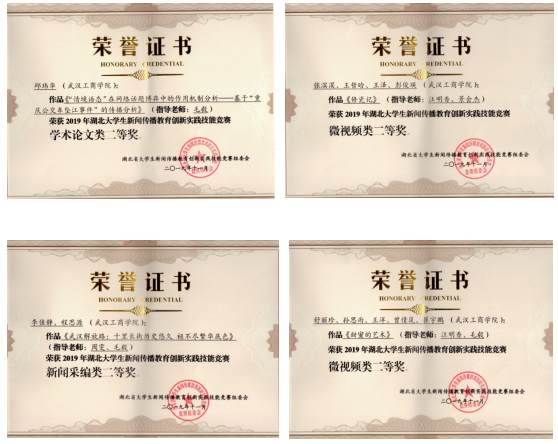 在毛毅老师指导下,李佳静、程思源的作品《武汉解放路:十里长街历史悠久褪不尽繁华底色》荣获2019年新闻采编类二等奖;邱玮华的作品《“情境语态”在网络话题博弈中的作用机制分析——基于“重庆公交车坠江事件”的传播分析》荣获2019年学术论文类省部级二等奖。