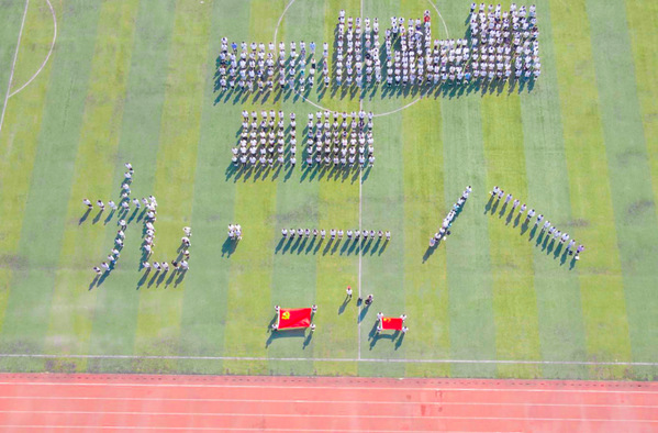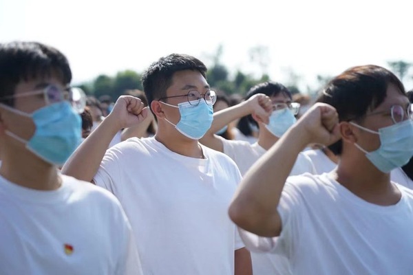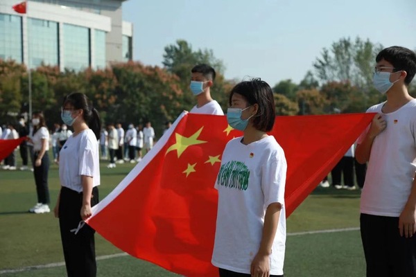 在9点18分,警报声响起,全体同学低头为1931年九一八事变中逝去的同胞默哀30秒。“尊敬的中国共产党,我是中国特色社会主义事业的接班人,不忘初心,铭记历史……”学校操场上,鲜艳的党旗和国旗光彩夺目,430名大一新生整齐排列出“九一八”的造型,142名党员、预备党员、发展对象、积极分子紧握右手大声宣告着“请党放心 强国有我”的铮铮誓言,并承诺作为新时代青年将铭记历史、珍爱和平,以实现中华民族伟大复兴为己任,不负时代,不负韶华,不负党和人民的殷切期待。