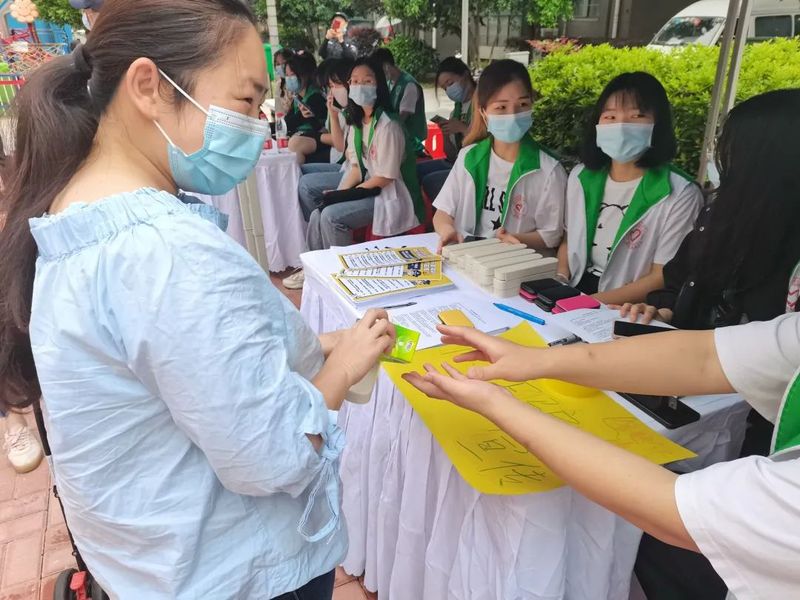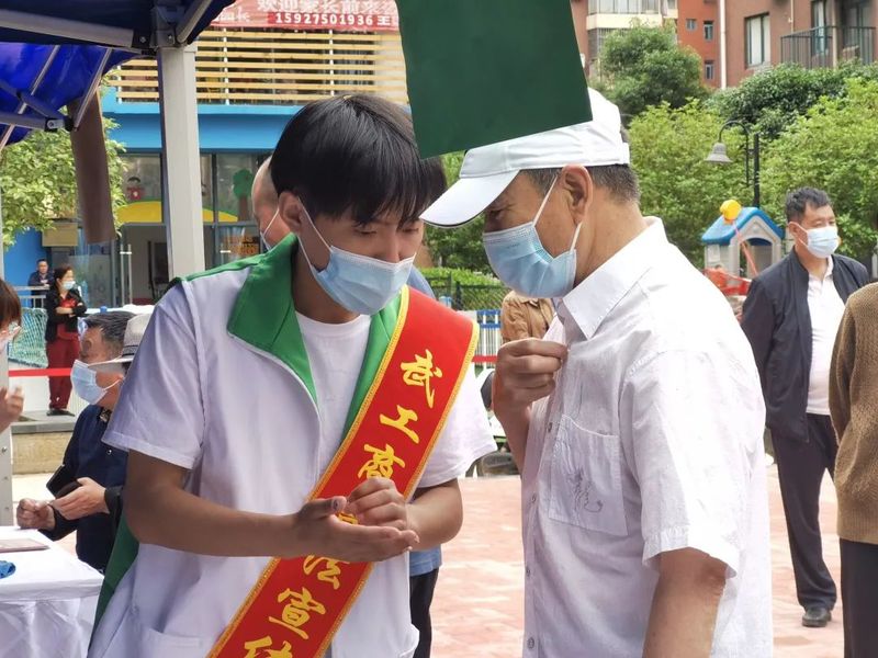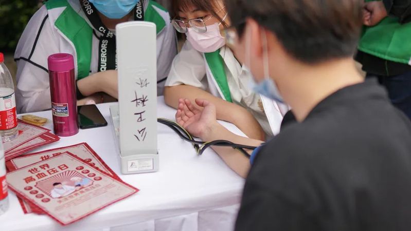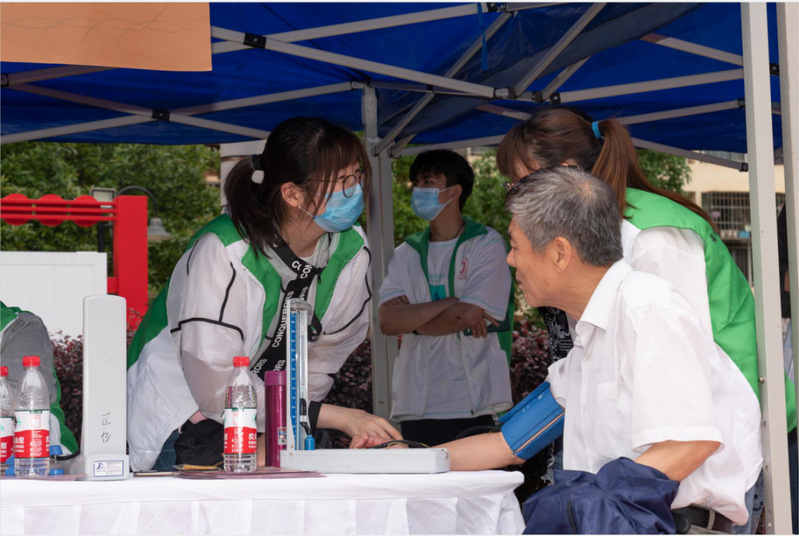 为居民量血压,白杨和刘晓彤和湖北经济学院青年志愿者协会会长共同负责的“量血压”板块,赢得了居民的广泛参与,社区居民张阿姨非常感谢大学生志愿者们走进社区,为居民献爱心。
