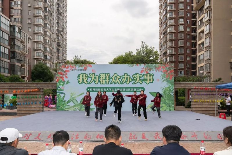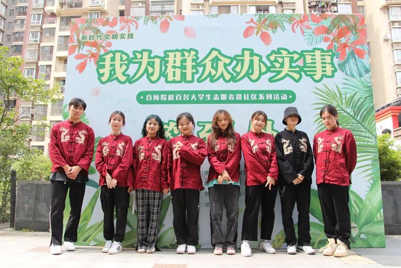 (通讯记者:王梅,摄影:侯娓丽、田洁)我和我的祖国,一刻也不能分割“古老的东方有一条龙,他们全都是龙的传人……,5月17日下午,东湖新技术开发区佛祖岭街道黄龙山社区正在举办“百所大学生进社区系列活动”,我院41名青年志愿者携手中南财经政法大学、华中科技大学、湖北经济学院法商学院、武汉音乐学院等100名学生走进黄龙山社区,为社区居民提供文艺节目演出、反诈骗宣传、证件照拍摄、民法典普及、职场服装搭配、义诊等15项志愿服务内容。
