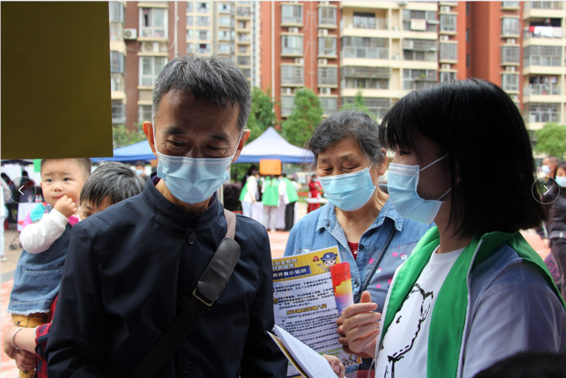 图为志愿者为居民解答问题