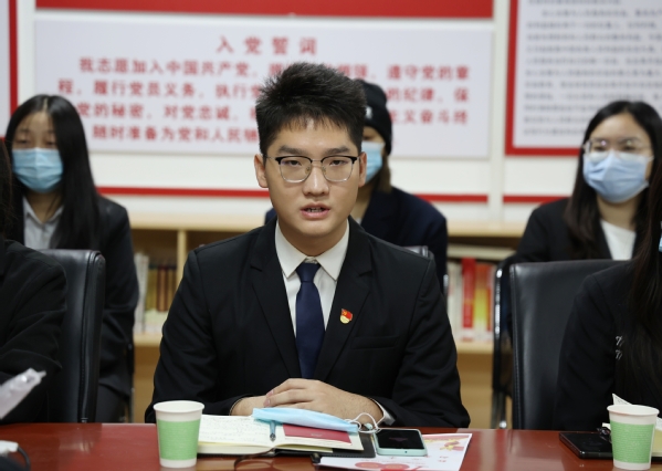 19级法学本1班的郜嘉启结合过去一年在法学学生党支部担任组织委员一职的经验谈道,作为一名大学生,也作为一名党员,我们身上担着更多的责任,我们要不忘初心,在日后的学习和工作中严格要求自己,全心全意为人民服务。