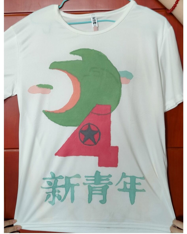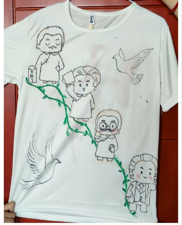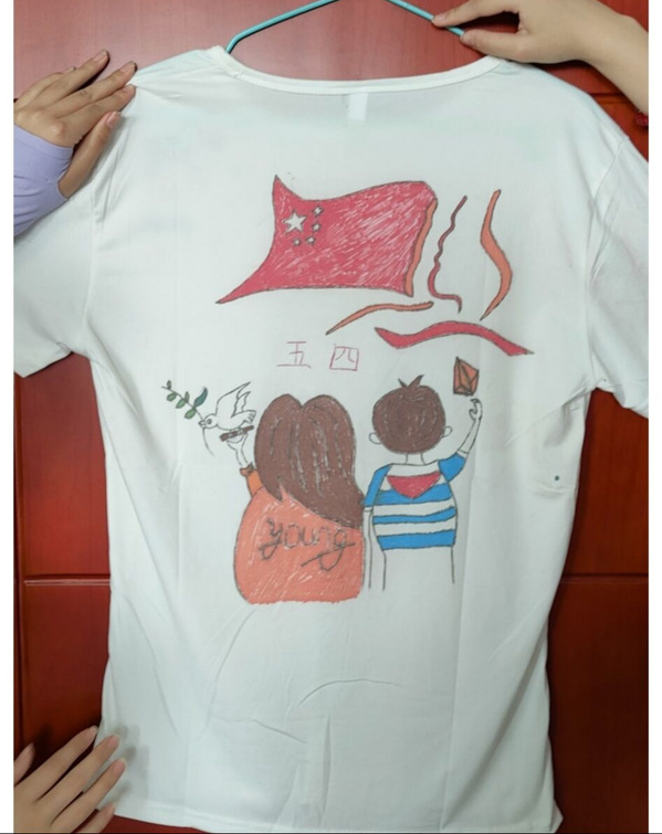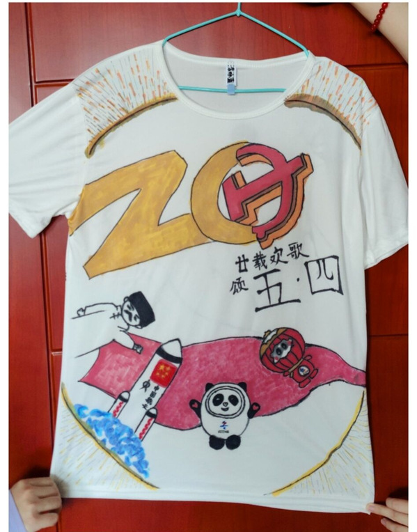 本次共有十名同学参加文化衫制作,同学们紧紧围绕着五四青年节、建校二十周年等为主题进行了文化衫创作。在本次活动的主题下,梦想的画笔,开始行走在白色的文化衫上。于是,一场火热的彩绘文化衫活动拉开了帷幕。通过脑海创意想象、铅笔描图、颜料调和与上色,一幅幅梦想的篇章呈现到了眼下。