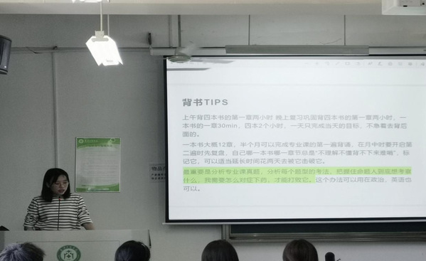 会议开始,陈梦琪学姐简单介绍了自己的备考过程,随后结合自身实际为同学们解答了考研中可能出现的问题。考研时间跨度很长,既是一场心理战,也是一场长途跋涉。针对同学们最关心的规划的问题,陈梦琪学姐提出:“个人规划是十分重要的,这种规划不是需要多么详细,而是要确定一个基本的目标,大学四年就奔着这个基本的目标去努力、去坚持;没有规划的生活必定会变得迷茫。”
