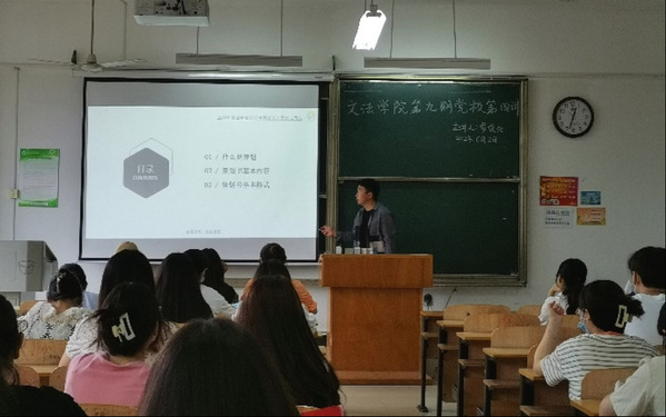 新闻学学生党支部(记者:刘芝圻 摄影:刘芝圻)6月2日中午12:30分,武汉工商学院文法学院第八期党校培训第四讲在综合楼208展开,由文法学院新闻学学生党支部组织委员罗保浩担任主讲人。