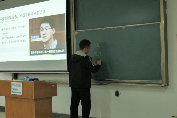 视频结束,罗保浩学长在黑板上写下三个词作为本次党课的关键词:目标、过程、结果。他用自己举例,由浅入深地为我们讲解他在大学期间的经历与感悟。“我是一个很能‘作’的人,从踏入武汉工商学院以来我就下定决心不能平庸的度过四年。”但是罗保浩学长并没有盲目的去达到什么标准完成什么要求。他首先清晰了自己的目标:“比如考研,之前我也有过考研的目标,并且也想加入武大华科等顶级学府。可英语作为我的软肋,很难达到要求。那便要及时修正目标,换个目标,或者创业就业。”