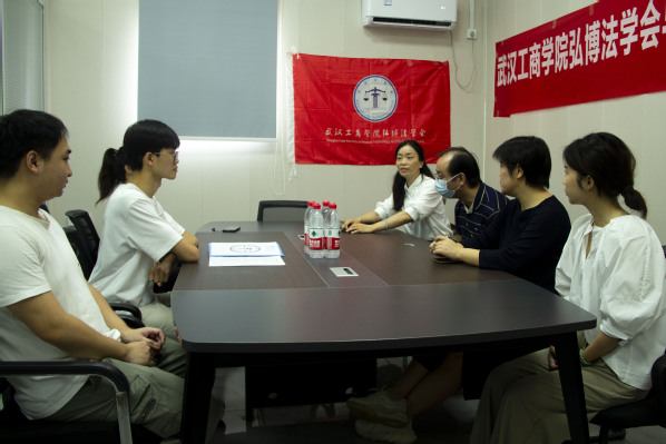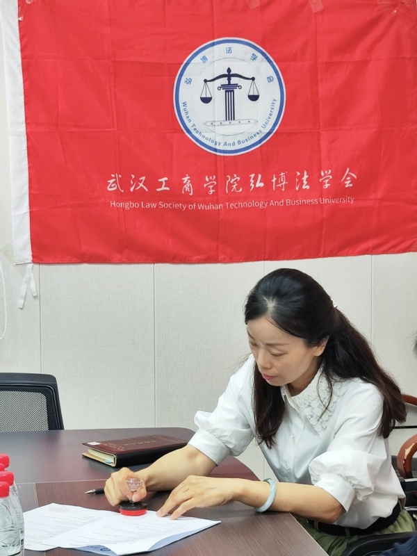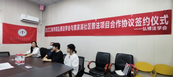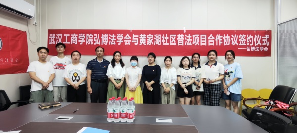 6月14日上午9:00,武汉工商学院文法学院弘博法学会与青菱街道黄家湖社区签订普法项目合作协议。武汉工商学院校团委副书记叶之培,文法学院法学系主任张威,弘博法学会指导老师李巧玲参加仪式。