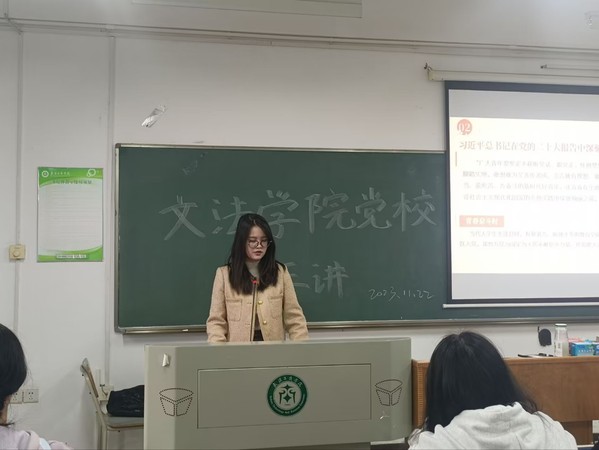 (记者 摄影:解晓凡)2023年11月22日12:30,法学学生党支部书记李红在外语楼620教室为第十二期党校的学员上了一堂主题为“端正入党动机 坚定理想信念”的党课。