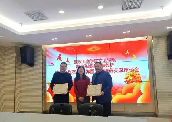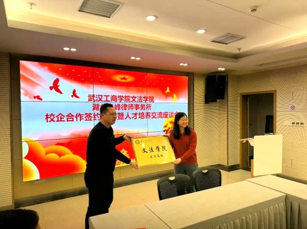 会议最后,双方签署了《武汉工商学院专业实习基地协议书》,共同为“武汉工商学院文法学院实习基地”牌匾揭牌。此外,陈敏书记向李汉洪主任、胡锦鹏律师颁发外聘导师聘任证书。此次建立专业实习合作基地,将充分发挥双方“人才培养中心”和“人才实践基地”优势,通过学校、律所两种不同的教育环境和资源的共享融合,建立一种“旋转门”机制。持续深化法学专业建设、推进复合型、应用型、创新型法治人才培养。