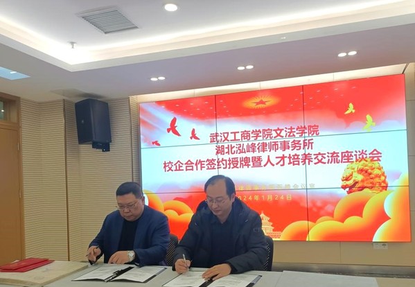 为扎实推进校企协同育人,搭建校企人才供需对接平台,实现优势互补,强化人才培养,促进法学理论与法治实践相融合,2024年1月24日上午,武汉工商学院文法学院法学系与湖北泓峰律师事务所校企合作签约授牌仪式在湖北泓峰律师事务5楼会议室举行。湖北泓峰律师事务所主任李汉洪、党支部副书记刘松,武汉工商学院文法学院党总支书记陈敏、法学系主任张威、教师代表等12人出席了本次会议。