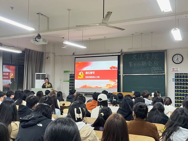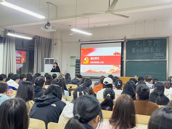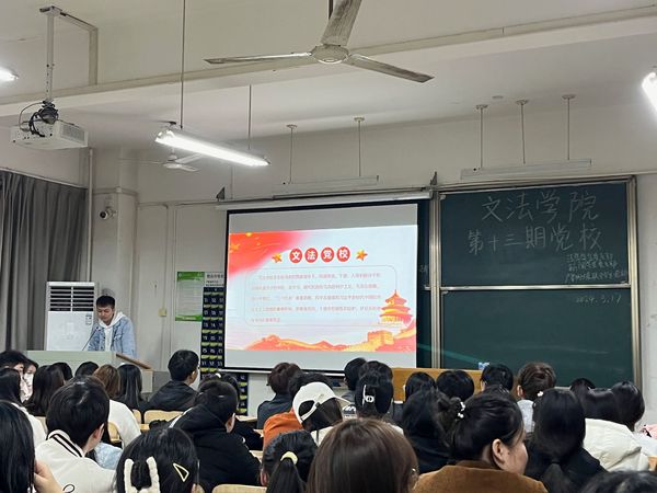 文法学院讯 (记者:肖耀阳)由武汉工商学院文法学院党总支组织的“文法学院第十三期党校开班仪式”于2024年3月17日19:00在综合楼305展开。各专业学生党支部的负责人以及文法学院第十三期党校积极分子参与了此次仪式,仪式由22级法学学生杨家兴同志主持。本次开班仪式旨在加深第十三届党校学员们对党的认识,端正入党动机,坚定入党信心,培养一批具有真才实学、又具有坚定共产主义信念的入党积极分子,为党输送新鲜的血液,壮大党的队伍,为更好的建设中国社会主义社会贡献出力量。