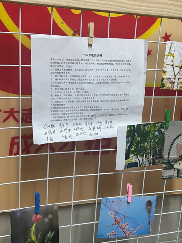 法学学生党支部 (记者:朱子悦)2024年4月8日,武汉工商学院文法学院法学学生党支部的入党积极分子们在文法学院的“一站式”学生社区2栋102社区驿站举办了主题为“节约每一度电,节约每一滴水”的主题讨论会。本次活动首先阅读撰写的节水节电倡议书,然后每位活动参与者在节水节电倡议书上签字。张贴在社区驿站门口用作宣传并以自身作表率,倡导更多人提高节约意识。在节水节电倡导书上签完字之后,每个人就开始轮流发表自己日常生活中是如何切实做到节水节电的。通过开展节约用水用电的主题活动,增强大学生的节约意识,让学生了解到水和电的重要性,树立水生态文明的观念和意识,掌握更多关于水生态文明的知识和水资源的各种现状;以及电力资源的现状,使同学们逐渐养成节约用水、节约用电的好习惯,形成良好校园风气,并通过同学们的宣传和倡导,推动家庭以至整个社会实现水资源和电资源可持续利用。