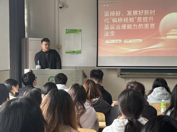 接着主讲人杨子健以一段“枫桥经验”纪实视频,引导在场人员思考“枫桥经验”是什么,通过讲述当前我国“熟人社会”向“陌生人社会”的转型现状:人口流动频繁、利益格局多元、公众诉求拓展且权利意识增强。进而提出面对新形势,基层治理需从“社会管理”向“社会治理”转型,以法治化、精细化、智能化构建共建共治共享格局,筑牢执政根基的必要性。同时,他结合“枫桥经验”的诞生与演进,深刻讲述了新时代“枫桥经验”是提升基层治理效能、确保社会长期稳定,进而保障中国式现代化行稳致远的战略性举措,深刻彰显了“中国之治”的独特智慧与优势。