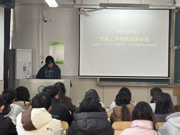 接着由主讲人王钰童带领大家深入解读全国两会精神。会议明确,2026年作为“十五五”规划开局之年以及中国共产党成立105周年的重要历史节点,我国法治建设已迈入全新发展阶段。会议将法治作为贯穿始终的红线,全方位融入高质量发展、民生保障、生态文明建设、社会治理现代化等法治发展路径,以良法善治为中国式现代化筑牢法治根基。会议同时强调,当前新兴领域法治需求持续上升,基层法治建设迫切需要新鲜血液,为青年拓展了多元发展空间。时代赋予法学青年新的使命,作为青年学生需兼具坚定的法治信仰、扎实的专业功底、强烈的社会责任感与创新的法治思维,以青春之力践行法治使命,为法治中国建设注入青年动能。