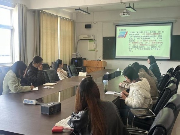 会上,窦玲老师首先传达了2026年中国大学生计算机设计大赛的核心赛事信息。2026年大赛分设11个大类,分别是(1)软件应用与开发;(2)微课与AI辅助教学;(3)物联网应用与物联网创新转化(创业实践);(4)大数据应用;(5)人工智能应用;(6)信息可视化设计;(7)数媒静态设计;(8)数媒动漫与短片;(9)数媒游戏与交互设计;(10)计算机音乐创作;(11)国际生“汉学”(“中华优秀传统文化”数智创作)。其中(6)至(11)共6个大类作品主题的是“中国古代建筑成就——中华优秀传统文化系列之六”,形成六大核心赛道主题,涵盖信息可视化设计、数媒静态设计、数媒动漫与短片等多个契合新闻传播类专业的竞赛方向。这6个大类作品内容包括民居、官府、皇宫、桥梁(不含庙宇、宝塔),时间限在1911年以前。值得一提的是,本届赛事全面体现“AI+”赋能赛事的同时,对AI工具使用也作出了明确规范,注重对知识产权边界的明确与保护。