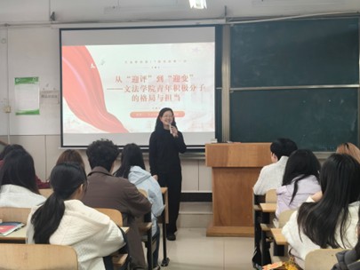 (文法学院讯谢宛非)由武汉工商学院文法学院党总支组织的文法学院第十七期党校第一讲——从“迎评”到“迎变”,文法学院青年积极分子的格局与担当于2026年3月26日12:30在综合楼306展开。本次会议由文法学院党总支书记陈敏老师主持,文法学院第十七期全体入党积极分子参加本次会议。